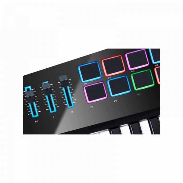 – 8 faders rétroéclairés assignables pour le contrôle des paramètres de vos instruments virtuels
