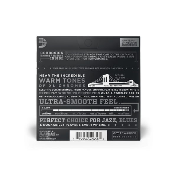 Plébiscitées par les guitaristes de jazz, ainsi que des légendes du blues comme Gary Clark Jr., ces cordes à filet plat offrent un toucher ultradoux et des sonorités remarquablement chaleureuses, tout en facilitant des glissements silencieux sur toute la longueur du manche. Fabriquées avec une âme en acier riche en carbone, les Chromes sont dotées d’un filet en ruban d’acier inoxydable aplati, qui est enroulé autour d’une série complexe de sous-enroulements entrelacés, puis poli avec haute précision pour offrir un toucher ultradoux et des sonorités qui trouvent idéalement leur place dans les enregistrements. Les jeux 10-48 Extra Light avec troisième corde non filée proposent le tirant le plus léger pour les cordes à filet plat et sont composés d’une corde de sol en acier sans filet qui offre davantage de flexibilité.