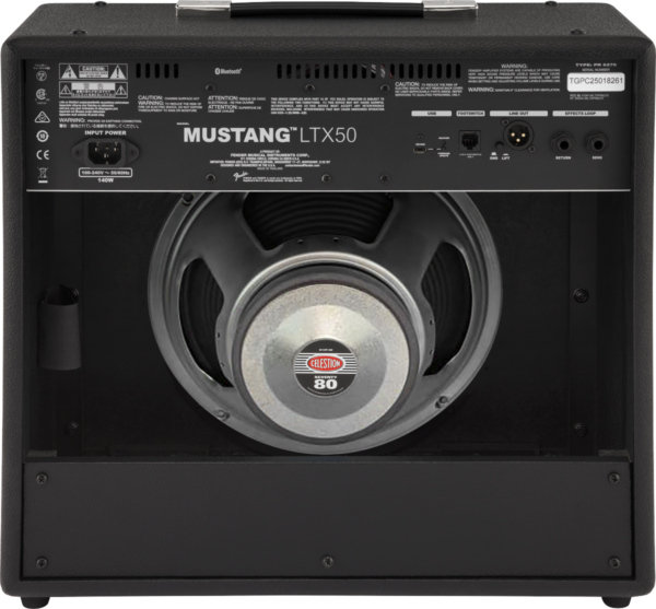 Le Mustang LTX 50 est parfait aussi bien pour s’entraîner que pour jouer en live. Il dispose pour cela d’un haut-parleur Celestion G12P-80 de 12” et vous pourrez le compléter par un footswitch à cinq boutons optionnel. Vous pourrez en outre utiliser sa connexion Bluetooth® intégrée pour jouer sur vos morceaux préférés, mais aussi créer, modifier, télécharger et partager vos presets à l’aide de l’appli Fender Tone.
