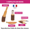 Le coffret comprend une gamme variée d’appeaux manuels, chacun soigneusement ajusté pour reproduire les chants spécifiques des oiseaux communs de nos campagnes, tels que la poule d’eau, le canard, le moineau, la grive musicienne, et le rossignol. Fabriqués avec des matériaux de haute qualité comme le buis et le hêtre, et finis avec un vernis alimentaire sans danger, ces instruments garantissent non seulement une sonorité authentique et précise, mais aussi une utilisation sûre pour tous les âges.