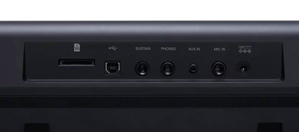 - Connexions : Alimentation CC, USB-MIDI / USB audio, casque / sortie (jack 6,3 mm), entrée (jack 3,5 mm), microphone (jack 6,3 mm), pédale de sustain (jack 6,3 mm), emplacement pour carte SD