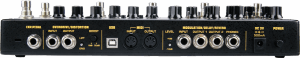 - Entrées : instrument/pédale d’effet, pédale d’expression, insert effet