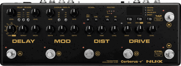 Le Cerberus est un pédalier d’effets et de contrôle multifonction ultracomplet, offrant aux guitaristes une maîtrise immédiate et intuitive sur leur son grâce aux 6 footswitchs et aux nombreux contrôles physiques disponibles. Ce pédalier regroupe 4 types d’effets – Drive, Distorsion, Modulation, Délai – disposant chacun de leurs réglages et paramètres propres afin d’obtenir le son que vous recherchez.